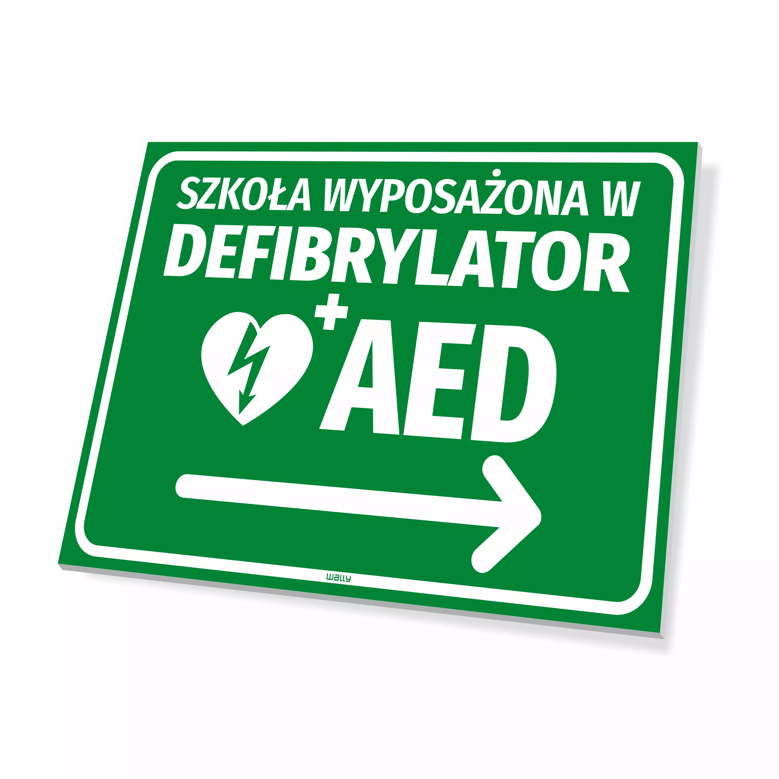 Tabliczka: szkoła wyposażona w defibrylator AED, kierunek w prawo