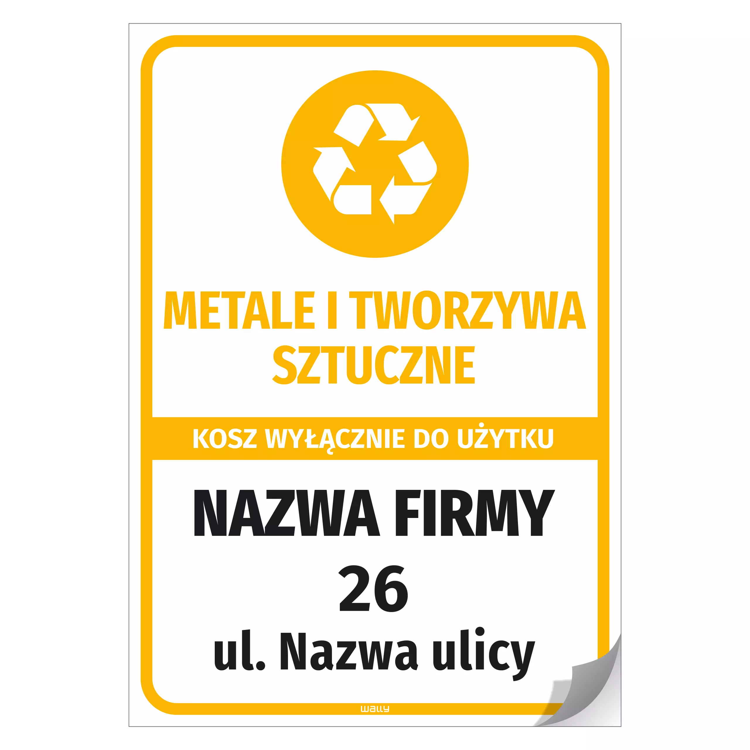 Naklejka na kosz z odpadami: metalei tworzywa sztuczne, wyłącznie do użytku - adres i nazwa firmy